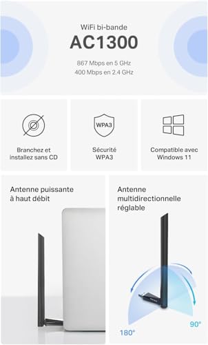 Couverture de signal plus large — Une antenne haute performance Forte vitesse Wi-Fi double bande — Vitesses allant jusqu'à 867 Mbps (5 GHz) + 400 Mbps (2,4 GHz) Plug and Play — Avec le pilote de boîte de réception intégré aux systèmes d'exploitation Windows, il vous suffit de vous connecter à votre ordinateur et de jouer Sécurité améliorée — La dernière amélioration de sécurité, WPA3, offre une protection renforcée en matière de sécurité des mots de passe personnels