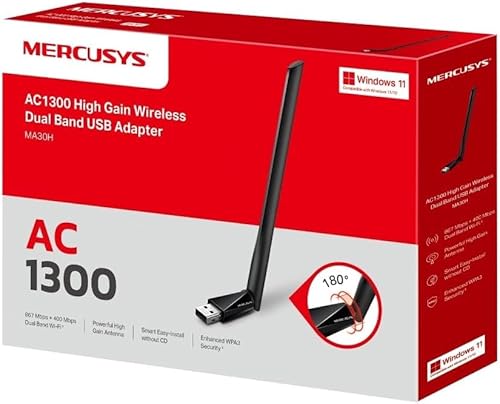MERCUSYS MA30H TP-Link Clé WiFi Puissante AC1300Mbps, Adaptateur USB WiFi, Antennes à Gain Elevé, Dongle WiFi, Bi-Bande, MU-MIMO, Brancher et Utiliser, Compatible avec Windows 11/10/8.1/7