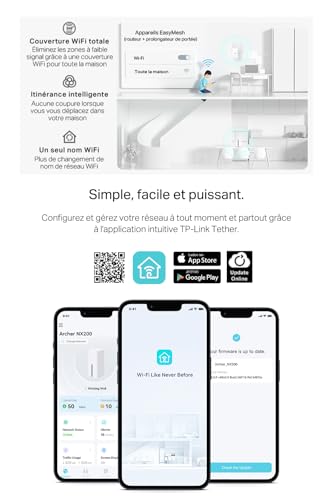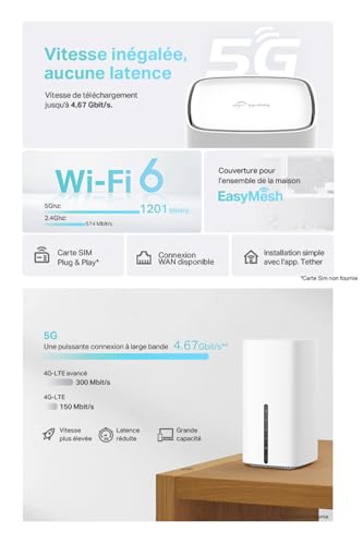 𝐀𝐗𝟏𝟖𝟎𝟎 𝐃𝐮𝐚𝐥-𝐁𝐚𝐧𝐝 𝐖𝐢-𝐅𝐢 𝟔: Offre des vitesses allant jusqu'à 1201 Mbps sur 5 GHz et 574 Mbps sur 2,4 GHz, assurant une connexion stable et efficace pour la navigation, le streaming et les jeux en ligne 𝐂𝐨𝐧𝐟𝐢𝐠𝐮𝐫𝐚𝐭𝐢𝐨𝐧 𝐟𝐚𝐜𝐢𝐥𝐞: Le routeur Wi-Fi est compatible avec les cartes SIM de divers opérateurs dans plus de 100 pays, y compris Orange, SFR, Bouygues Telecom, Free, NRJ Mobile, Coriolis, Auchan Telecom, Cdiscount Mobile, Prixtel, E.Leclerc Mobile, Sosh, B&You, Red by SFR etc; Branchez votre carte SIM et terminez la configuration en 3 minutes via l'application Tether (Vous devez entrer un CODE PIN lors de la configuration) 𝐋’𝐞𝐱𝐩é𝐫𝐢𝐞𝐧𝐜𝐞 𝟓𝐆 𝐮𝐥𝐭𝐢𝐦𝐞: Profitez d’un réseau 5G avancé jusqu'à 4,67 Gbit/s, partagez-le avec plusieurs appareils Wi-Fi et bénéficiez d’un streaming Ultra HD fluide, de téléchargements ultra-rapides et d’appels vidéo sans interruption, tout en exploitant pleinement les capacités de vos derniers appareils WiFi 7, smartphones, tablettes et casques VR 𝐌𝐨𝐝𝐞𝐬 𝐝𝐞 𝐟𝐨𝐧𝐜𝐭𝐢𝐨𝐧𝐧𝐞𝐦𝐞𝐧𝐭 𝐦𝐮𝐥𝐭𝐢𝐩𝐥𝐞𝐬: Le port WAN/LAN Gigabit permet au Archer NX200 de fonctionner comme un routeur sans fil traditionnel compatible avec les modems câble, fibre et DSL, et lorsque votre connexion Internet fixe échoue, le réseau 5G s'active automatiquement pour permettre une reprise rapide de vos vidéoconférences ou de vos diffusions en direct