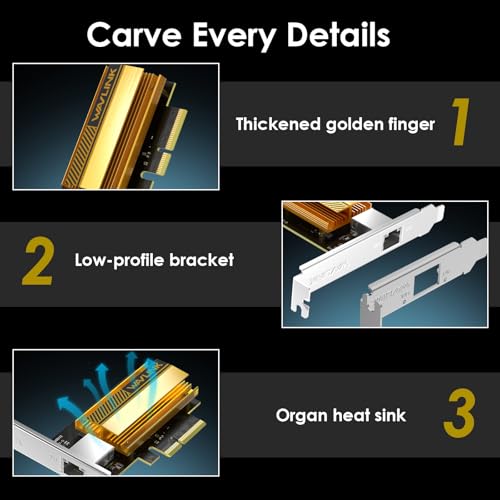 Blindage métallique robuste : Réduit les interférences électromagnétiques, améliore la stabilité et la fiabilité à chaque connexion. (Conseil : veuillez retirer le film plastique de l'interface PCI-e avant de la connecter à l'emplacement PCI-e du PC). L'excellente dissipation de la chaleur permet de réduire rapidement la température et de maintenir la stabilité de la transmission du réseau. PCIe vers 10G RJ45 : il s'adapte à diverses configurations d'emplacement PCI Express, telles que x4, x8 et x16, ce qui permet une installation et une interchangeabilité transparentes sur différentes cartes mères afin de répondre à divers besoins et configurations matérielles. Remarque : compatible avec les emplacements PCI-E uniquement, pas avec les emplacements PCI. Polyvalence du support flexible : Conçue avec un profil bas et un support standard, cette carte réseau 10G offre une flexibilité accrue pour diverses configurations d'ordinateur. Quelles que soient les spécifications de votre ordinateur, une installation sans effort est assurée, optimisant ainsi votre configuration matérielle. Transmission à grande vitesse 10G : Cette carte réseau 10G inaugure une nouvelle ère en matière de vitesse de transmission réseau, offrant des vitesses jusqu'à 10 fois supérieures aux vitesses gigabit traditionnelles. Elle offre une expérience en ligne exceptionnelle, garantissant des transferts de fichiers rapides, un streaming vidéo HD transparent et des jeux en ligne sans décalage.